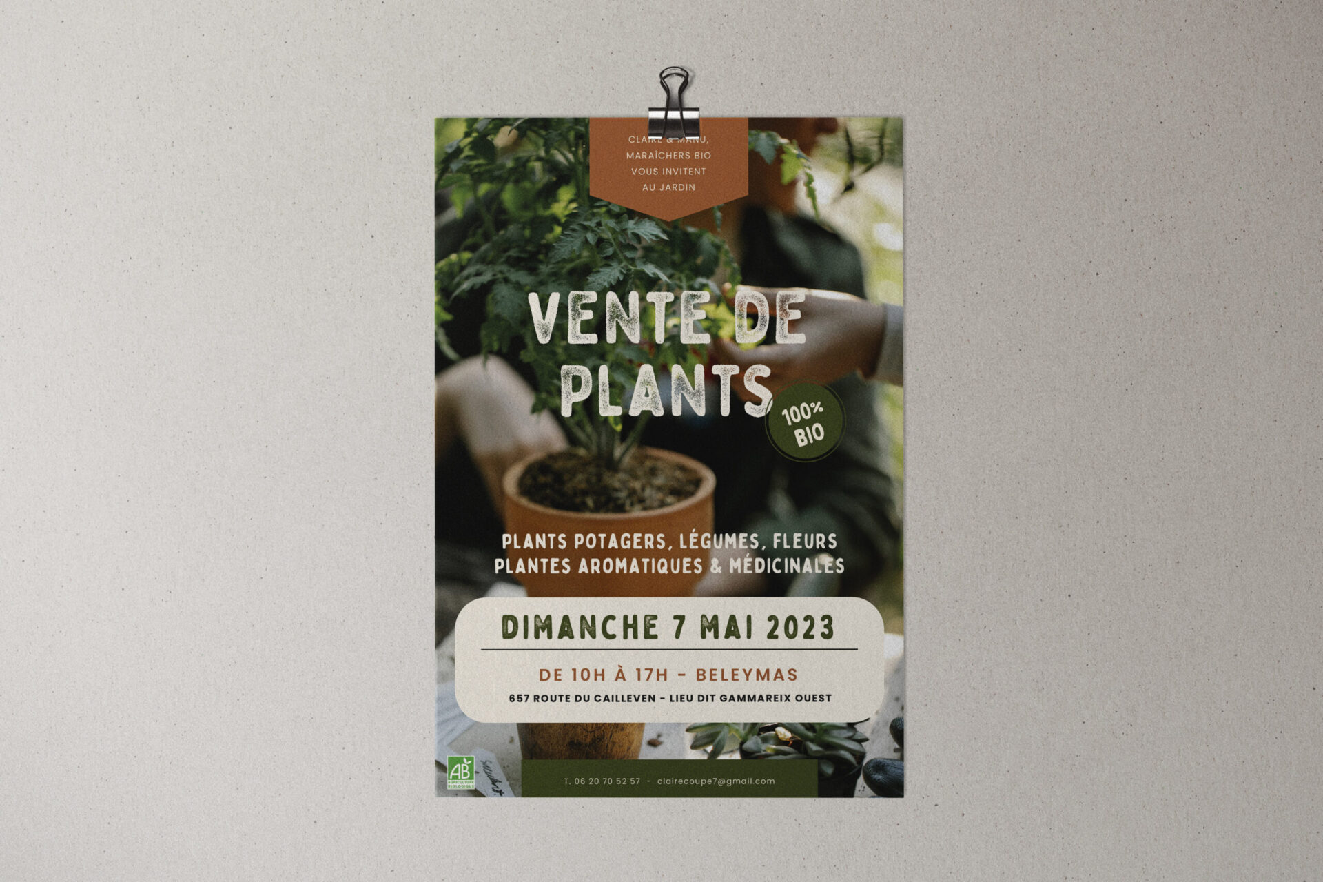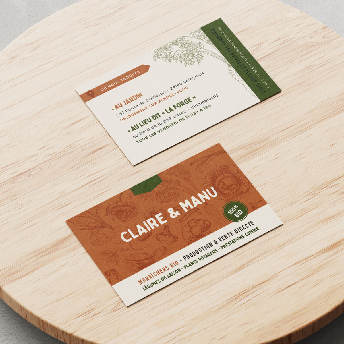 Concevoir une carte de visite sur-mesure et un flyer pour la vente annuelle de plants axé sur le local. Ces supports mettent en avant l’agriculture biologique. La carte est imprimé sur du papier non glacé, reflétant l’engagement écoresponsable de la ferme, et formant ainsi une connexion visuelle entre l’événement et les valeurs durables de l’exploitation.