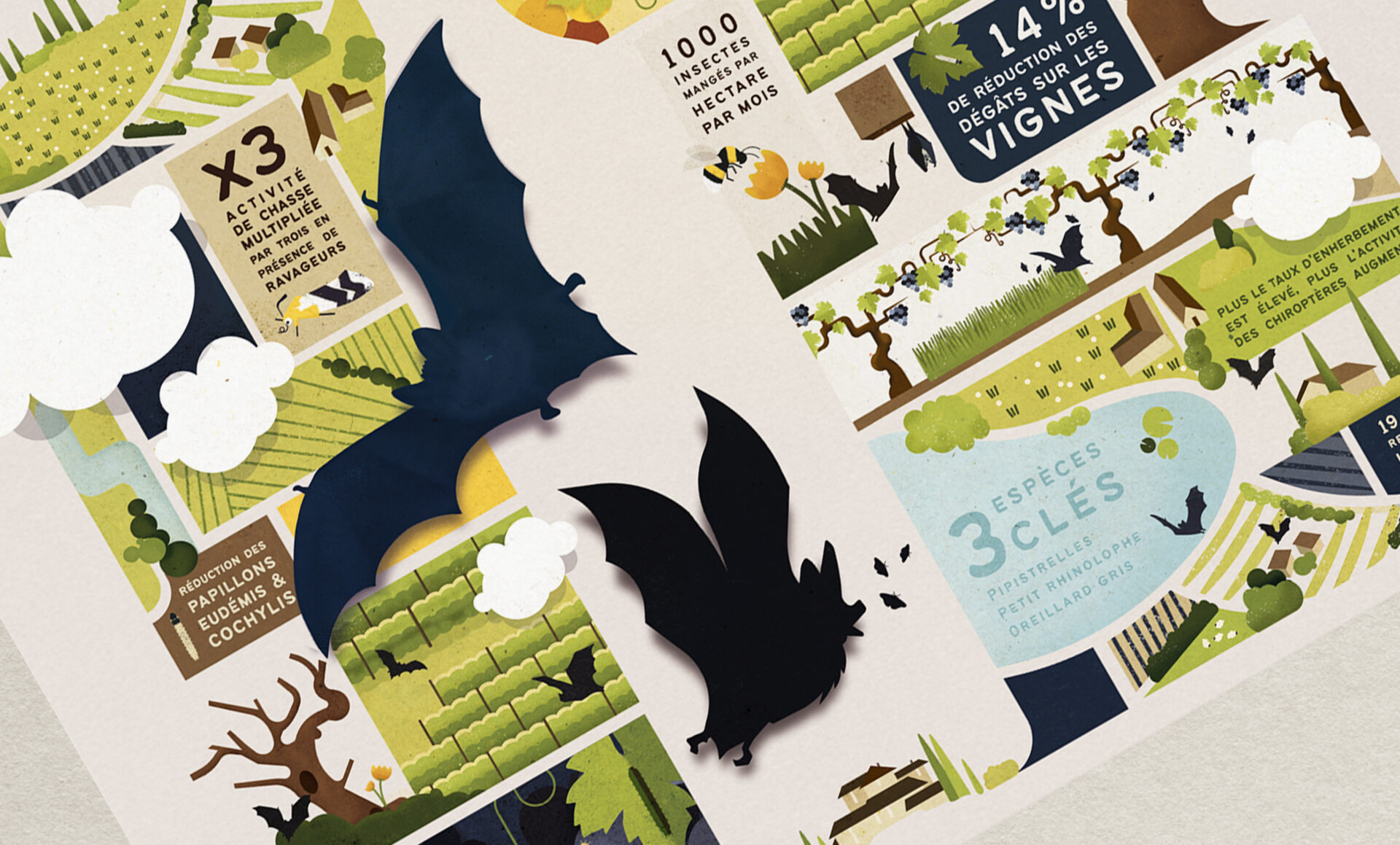Création d’un poster pour présenter les résultats du projet Vitichiraux qui met en évidence l’efficacité des chauves-souris dans la lutte contre les papillons ravageurs des vignobles. L’objectif est de mettre en lumière le rôle essentiel des chauves-souris comme prédateurs naturels, contribuant ainsi à la réduction des dégâts sur les cultures. Le poster vise à informer sur les pratiques et aménagements favorables à ces espèces, tels que les haies et la diversité paysagère, afin de sensibiliser à leur protection et à celle de leur habitat.