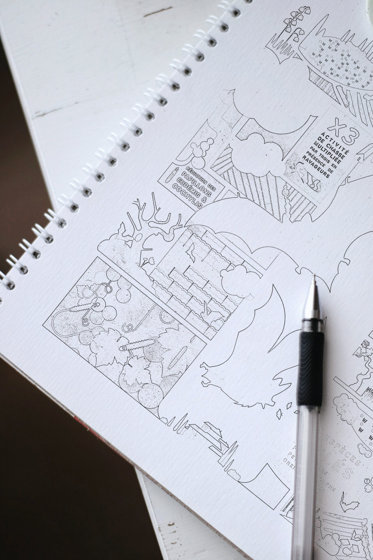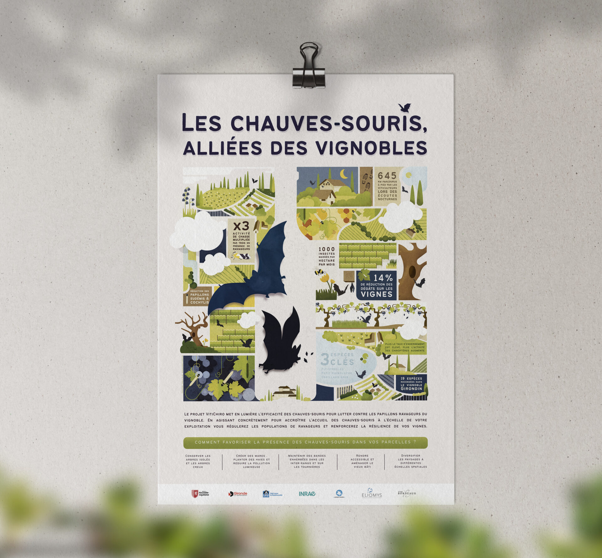 Création d’un poster pour présenter les résultats du projet Vitichiraux. Le concept visuel associe la forme des vignes à celle d’une bouteille, illustrant la connexion entre la préservation des vignobles et la qualité du vin. Cette affiche cherche à générer le sentiment que tout élément est à sa place, que l’équilibre naturel de la nature fonctionne. Cette approche, cherche à captiver l’intérêt et l’engagement du public en présentant une vision variée des paysages, tout en soulignant leur utilité potentielle pour les vignerons, tout en préservant la biodiversité. C’est un discours gagnant-gagnant qui met en avant les avantages pour tous. On retrouve en bas de l’affiche le sous titre permettant de faire le lien entre l’étude et ses résultats ainsi que les éléments textes indiquant comment favoriser la présence des chauves souris dans les vignobles.
